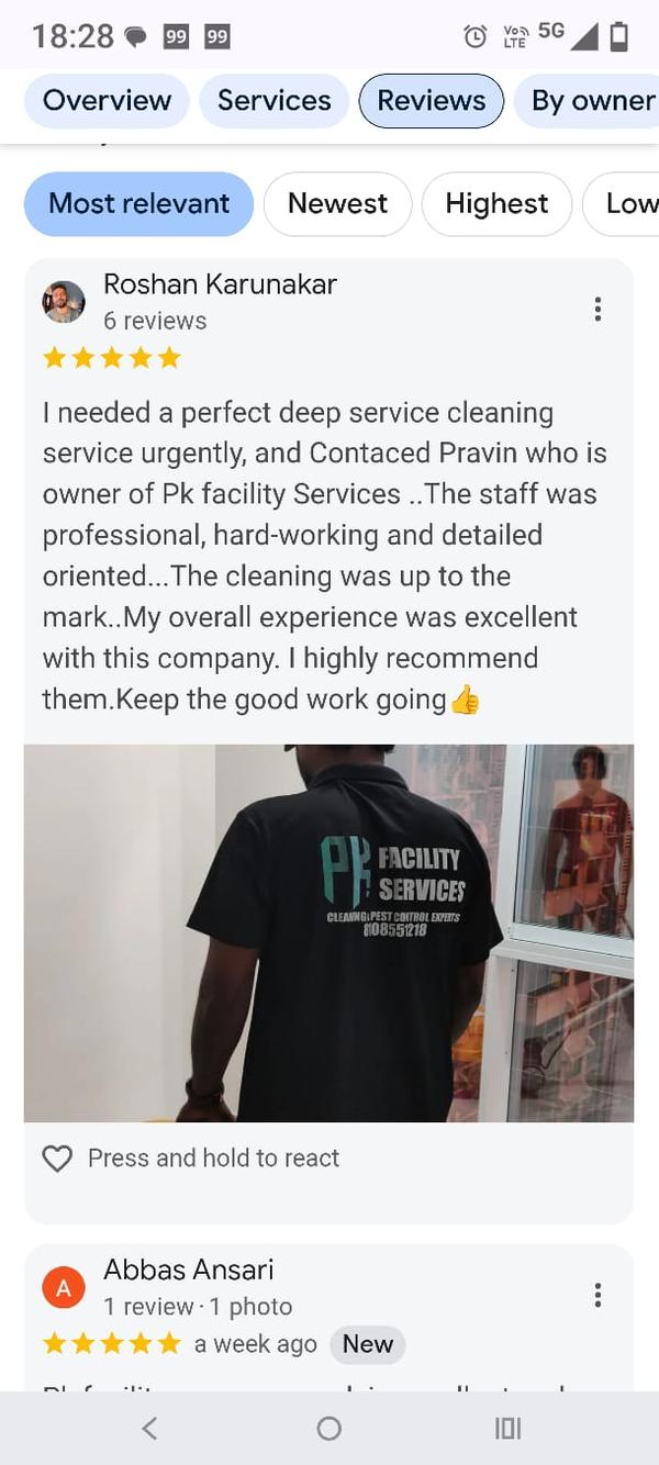 Pk Facility ServicesPK Facility Services is an integrated facility management company based in Andheri, Mumbai, offering a comprehensive suite of services to residential, commercial, and office properties. They specialize in housekeeping, cleaning, and maintenance solutions, with a strong focus on customer satisfaction. Key services offered General and deep cleaning: Provides comprehensive cleaning services for offices, commercial spaces, and residential properties. Specializations include: Post-construction cleaning Industrial cleaning Specialized cleaning: Services designed for specific items and areas. Carpet and sofa cleaning Window and glass cleaning Housekeeping: A range of housekeeping services to keep spaces clean and organized. Maintenance: General property maintenance is included in their comprehensive facility management offerings. Pest control: Provides pest control solutions to ensure properties are clean and safe. Operational standards and unique features Eco-friendly practices: Uses eco-friendly cleaning products to ensure safety and well-being for both clients and the environment. Customized solutions: Tailors services to meet the specific and unique needs of each client. Experienced professionals: Their team is equipped with the latest tools and expertise to provide efficient and thorough services. Convenient scheduling: Operating seven days a week, PK Facility Services offers flexible scheduling for its clients.